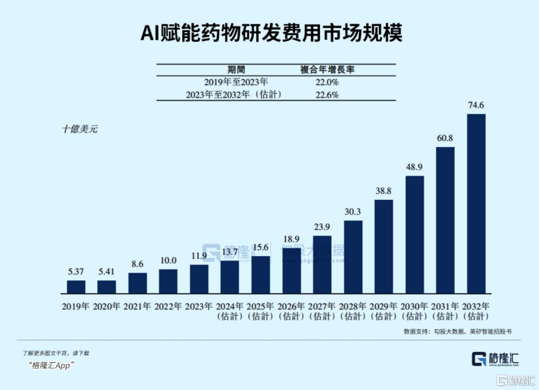 英矽智能招股书中预期,全球AIDD市场的规模将由2023年的119亿美元增加至2032年的746亿美元,复合年增长率为22.6%。