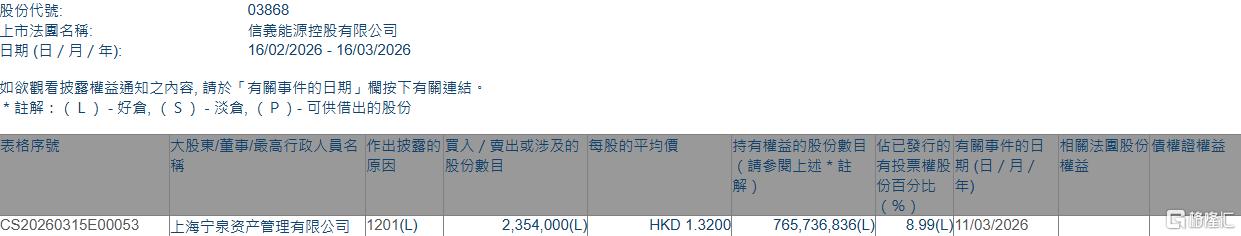 格隆汇3月16日丨根据联交所最新权益披露资料显示,2026年3月11日,信义能源(03868.HK)遭上海宁泉资产管理有限公司在场内以每股均价1.32港元减持235.4万股,涉资约310.73万港元。