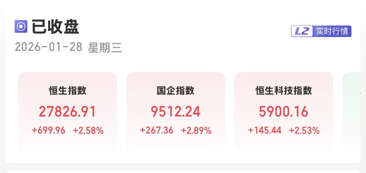 上证报中国证券网讯1月28日,港股三大指数表现强势。截至收盘,恒生指数涨2.58%,报27826.91点;恒生国企指数涨2.89%,报9512.24点;恒生科技指数涨2.53%,报5900.16点。