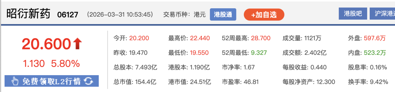 上证报中国证券网讯3月31日,港股生物医药板块走强。其中,昭衍新药H股开盘报20.2港元/股,开盘快速拉升后回落。截至10时53分,昭衍新药H股报20.6港元/股,涨5.8%。