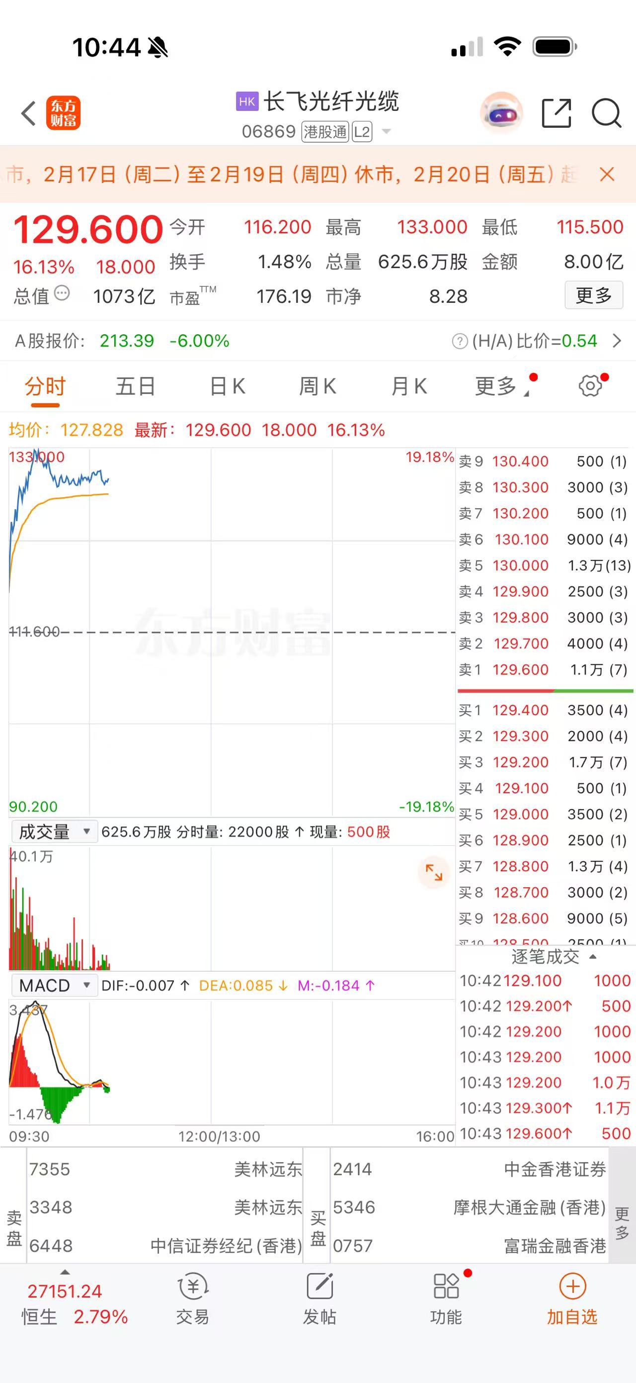 上证报中国证券网讯2月23日,港股光通讯概念股走强,长飞光纤光缆一度涨超19%,截至10时44分,长飞光纤光缆涨16.13%,报129.6港元/股;汇聚科技涨7.08%,报17.24港元/股;剑桥科技涨5.39%,报67.5港元/股。