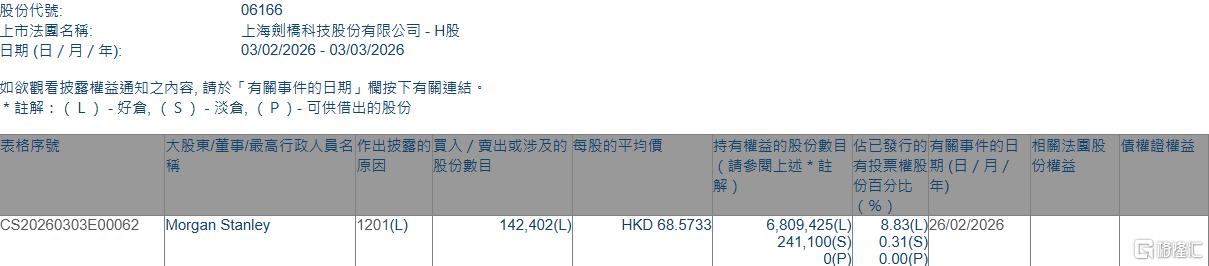 格隆汇3月3日丨根据联交所最新权益披露资料显示,2026年2月26日,剑桥科技(06166.HK)遭Morgan Stanley在场内以每股均价68.5733港元减持好仓14.24万股,涉资约976.5万港元。