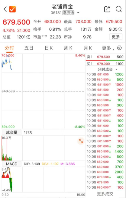 上证报中国证券网讯3月25日,老铺黄金开盘后涨超8%。截至10时09分,老铺黄金报679.5港元/股,上涨4.78%,成交金额达到9.05亿港元。