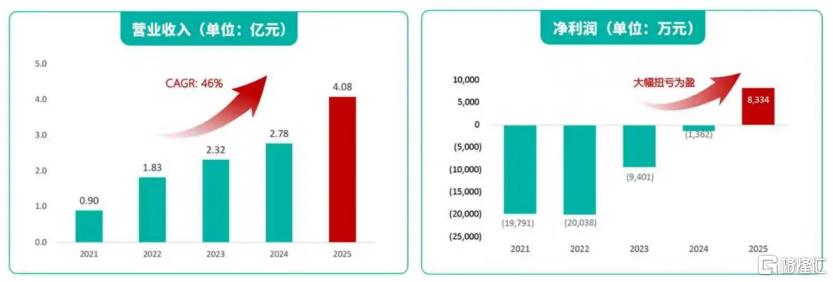 在经历多年的研发投入与市场培育后,公司2025年实现营业收入4.08亿元,同比增长46.9%,净利润达到8334万元,相较2024年亏损1362万元,成功实现重大扭亏为盈,正式迈入规模化盈利阶段。
