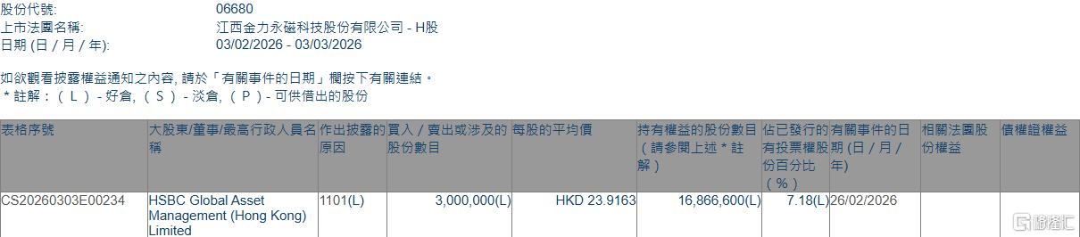 格隆汇3月3日丨根据联交所最新权益披露资料显示,2026年2月26日,金力永磁(06680.HK)获HSBC Global Asset Management (Hong Kong) Limited在场内以每股均价23.9163港元增持300万股,涉资约7175万港元。