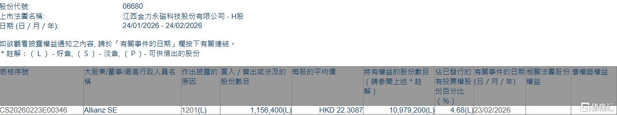 格隆汇2月24日丨根据联交所最新权益披露资料显示,2026年2月23日,金力永磁(06680.HK)遭Allianz SE在场内以每股均价22.3087港元减持115.64万股,涉资约2579.8万港元。