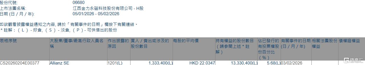 金力永磁(06680.HK)遭Allianz SE减持133.34万股