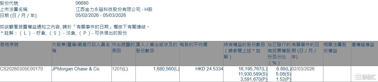 格隆汇3月5日丨根据联交所最新权益披露资料显示,2026年3月2日,金力永磁(06680.HK)遭JPMorgan Chase & Co.以每股均价24.5334港元减持好仓168.06万股,涉资约4123万港元。