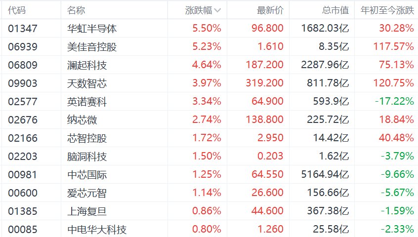 港股半导体股强势,华虹半导体涨超5%,澜起科技涨超4%