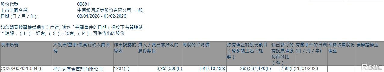 中国银河(06881.HK)遭易方达基金减持325.35万股