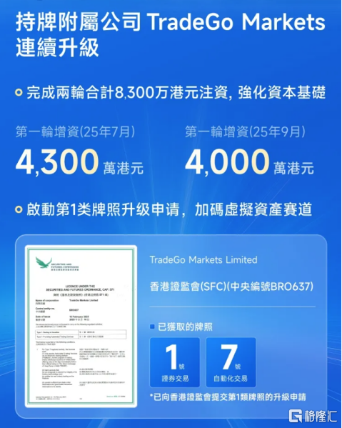 其中,持牌金融业务表现尤为突出,相关收益达4,490.5万港元,占总收益的55%,成为核心增长动力。旗下附属公司TradeGo Markets Limited的承销及分销服务收入达3,883.2万港元,同比跃升440%。