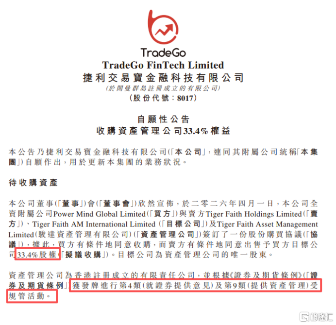 2026年4月1日,捷利交易宝(08017.HK)发布重磅公告,宣布公司全资附属公司Power Mind Global Limited与卖方、目标公司Tiger Faith AM International Limited及骏达资产管理有限公司签订股份购买协议,买方可有条件收购卖方持有的目标公司33.4%股权,目标公司是骏达资产管理的唯一股东。
