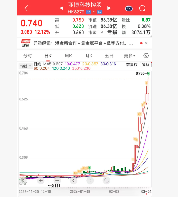 上证报中国证券网讯3月4日,亚博科技控股继续上涨,已经十连阳,近10个交易日累计涨幅超过200%。截至14时57分,报0.74港元/股,涨12.12%,最新市值86.38亿港元。