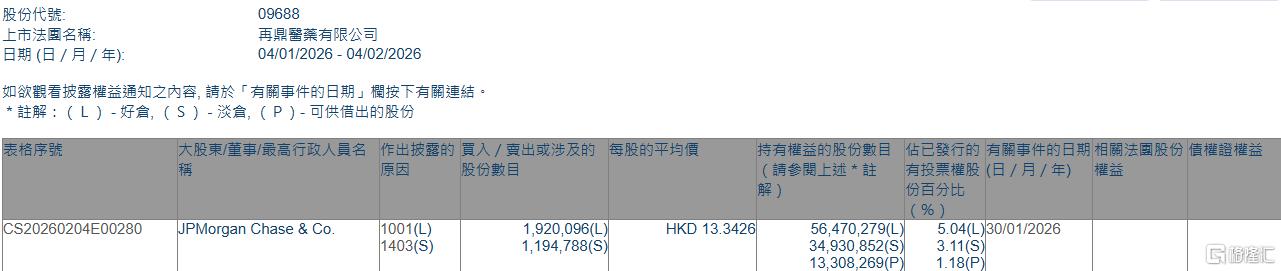 格隆汇2月4日丨根据联交所最新权益披露资料显示,2026年1月30日,再鼎医药(09688.HK)获JPMorgan Chase & Co.以每股均价13.3426港元增持好仓192.01万股,涉资约2561.9万港元。