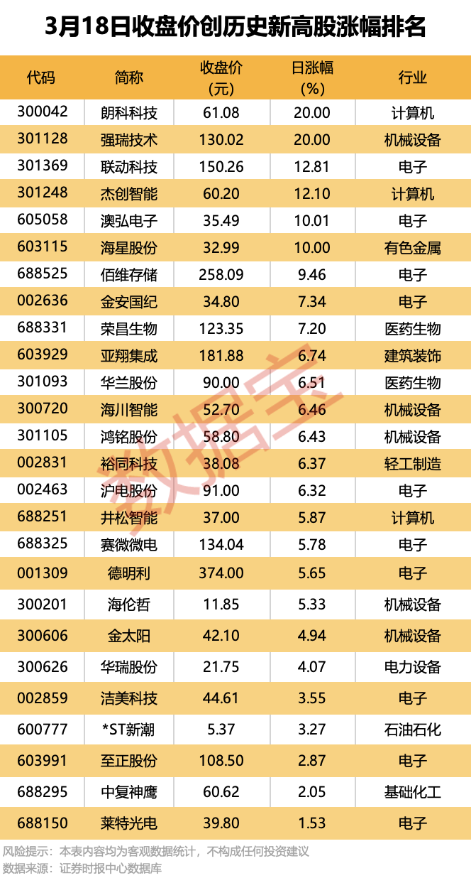 据证券时报·数据宝统计,不含近一年上市的次新股,今日共有26股收盘价创历史新高。从行业属性来看,电子、机械设备、计算机行业创新高的个股较为集中,分别有10股、5股、3股出现在名单中。收盘价创历史新高股中,今日股价平均上涨7.41%,涨停的有朗科科技、强瑞技术、澳弘电子等,涨幅居前的有联动科技、杰创智能、佰维存储等。