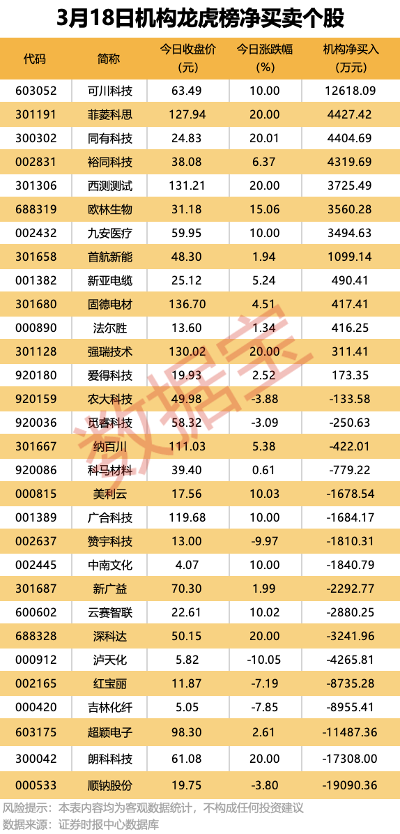 今日龙虎榜中,净买入个股有13只,净卖出的个股为17只。8股净买入金额均超千万元,可川科技获机构净买入1.26亿元,居首。菲菱科思、同有科技、裕同科技机构净买入金额均超4000万元。机构净卖出个股中,顺钠股份遭机构净卖出1.91亿元,居首;紧随其后是朗科科技、超颖电子,净卖出金额均超1.1亿元。