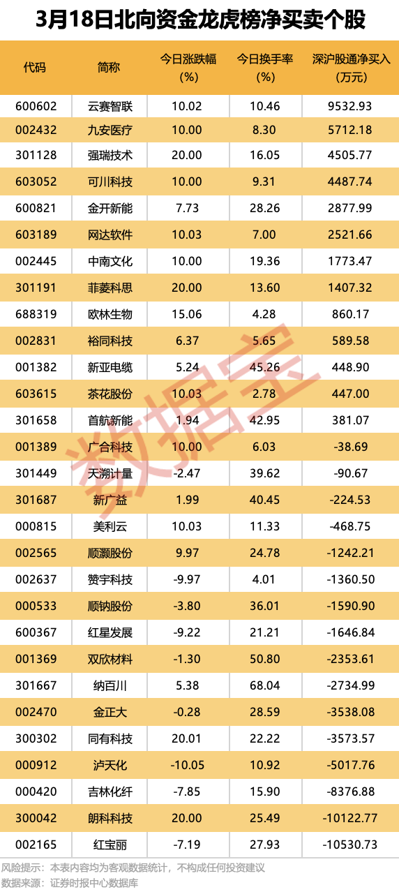 今日龙虎榜现身个股中,13股获北向资金净买入。云赛智联获净买入居首,金额达9532.93万元;九安医疗、强瑞技术、可川科技获北向资金净买入均超4400万元。北向资金净卖出16股,红宝丽遭净卖出1.05亿元,居首。朗科科技、吉林化纤、泸天化遭净卖出均超5000万元。