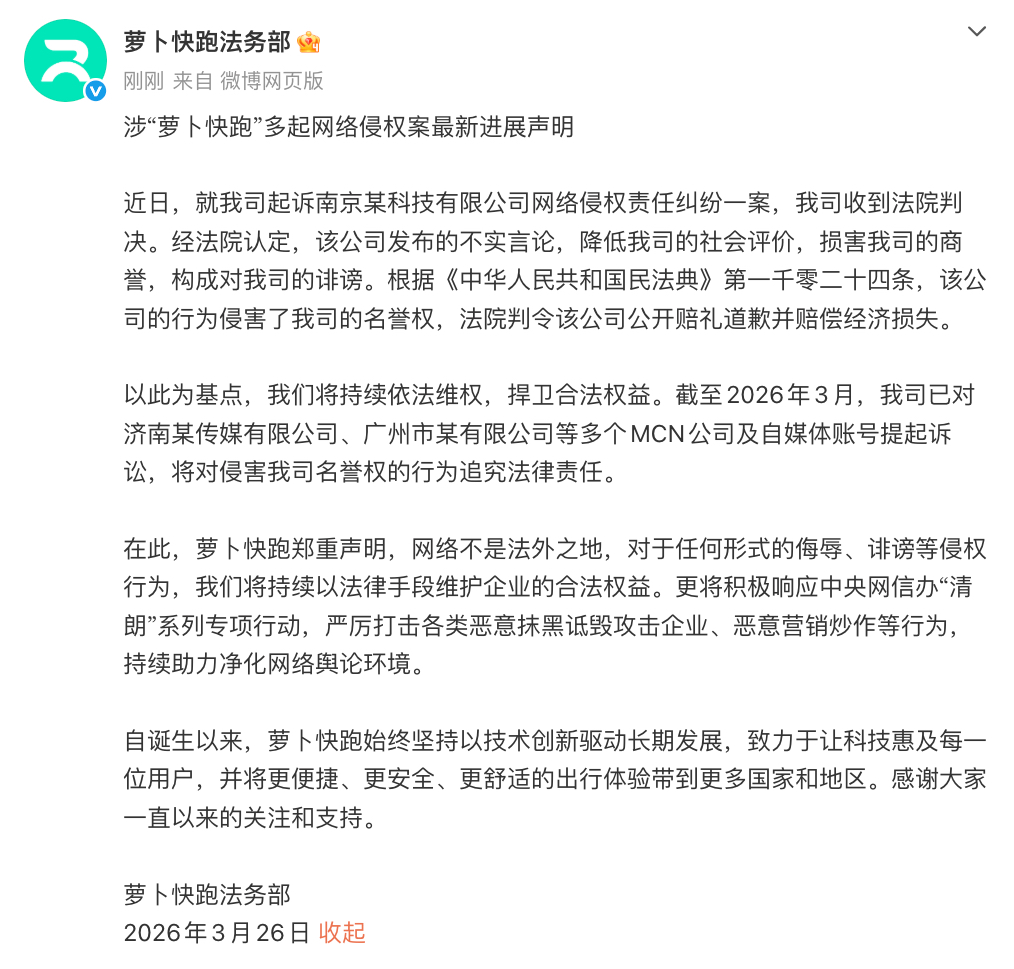 此次诉讼并非孤例。据萝卜快跑方面透露,截至2026年3月,其已对多个MCN机构及自媒体账号提起诉讼,集中打击一批涉嫌恶意造谣、抹黑企业的网络账号。