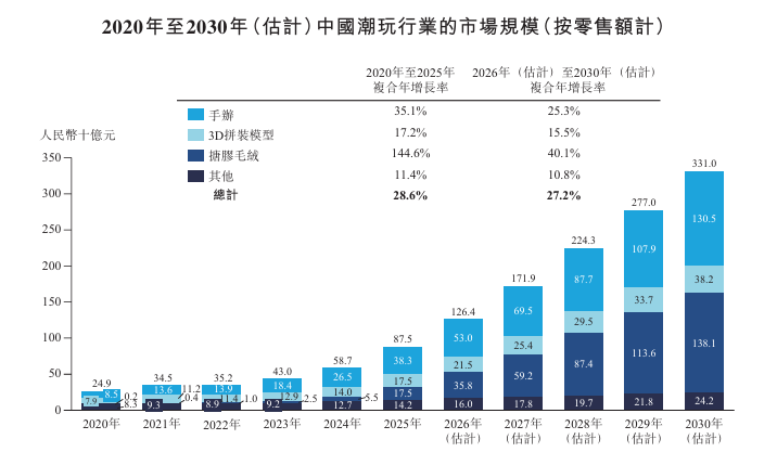 潮玩指具有高收藏价值的玩具,按产品类别划分,潮玩可分为手办、3D拼装模型、搪胶毛绒等。中国潮玩行业呈现快速增长态势,零售额由2020年的人民币249亿元跃升至2025 年的人民币875亿元,实现28.6%的强劲复合年增长率。