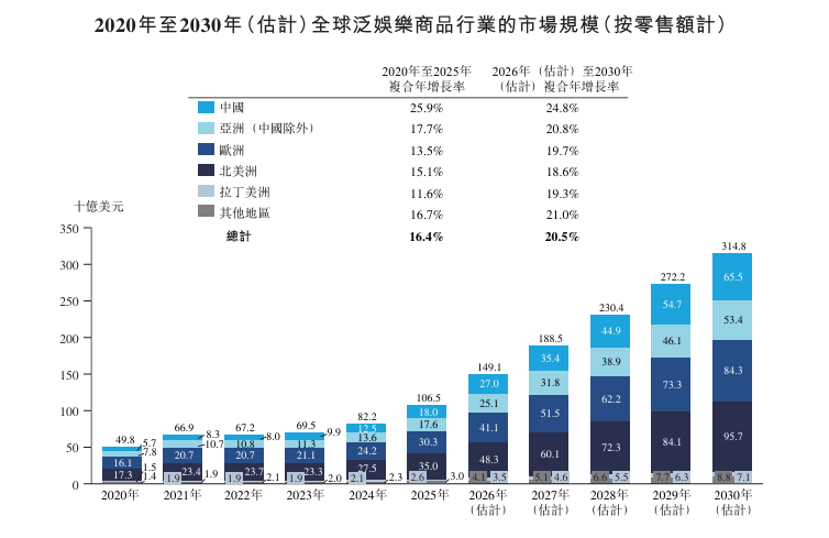 展望未来,该行业预计将受益于IP全球化的持续推进、品类拓展的不断深化及在多元化客户群体中更深层次的市场渗透,预计到2030年市场规模将达到3,148亿美元,2026年至2030年复合年增长率达20.5%。