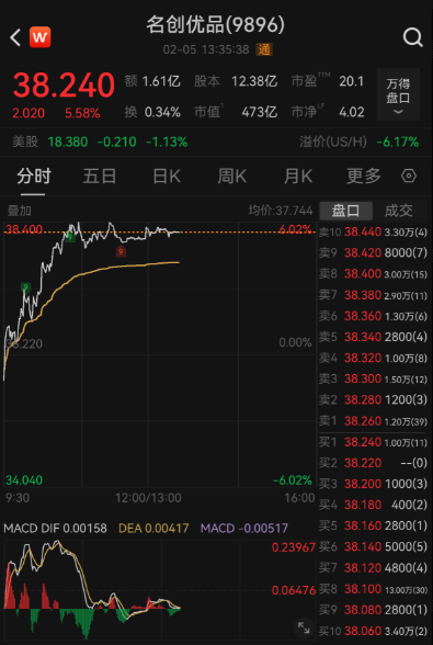 上证报中国证券网讯2月5日,名创优品逆势走高,一度涨超6%。截至13点35分,名创优品上涨5.58%,报38.24港元/股,成交额达到1.61亿港元。