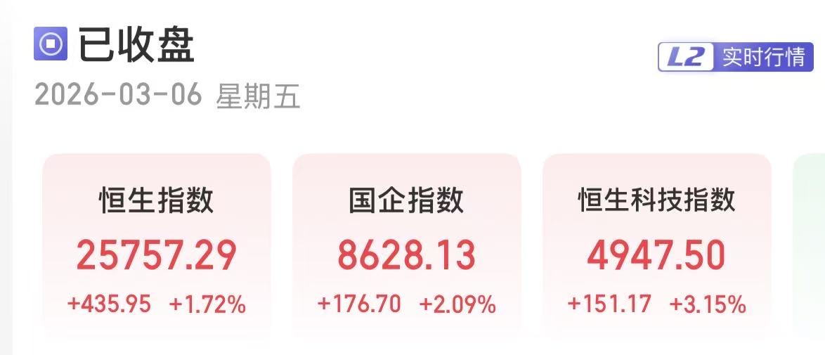 上证报中国证券网讯3月6日,港股三大指数回暖。截至收盘,恒生指数涨1.72%,报25757.29点;恒生国企指数涨2.09%,报8628.13点;恒生科技指数涨3.15%,报4947.5点。