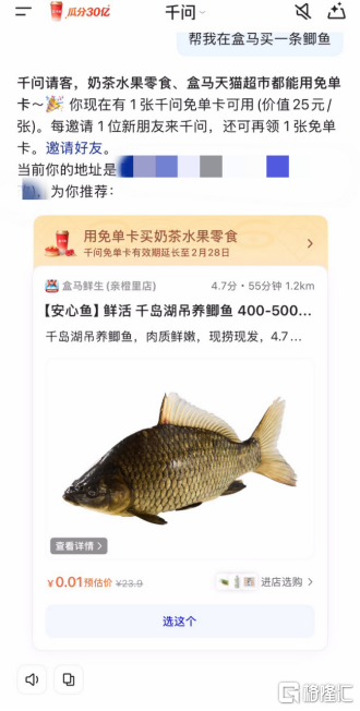 用户只需对千问说"帮我在盒马买一条鲫鱼"或者"帮我在盒马买一盒鸡蛋",千问就可以从盒马的海量商品中挑出适合的商品,并根据用户位置匹配附近的盒马门店,在用户下单后即时配送。
