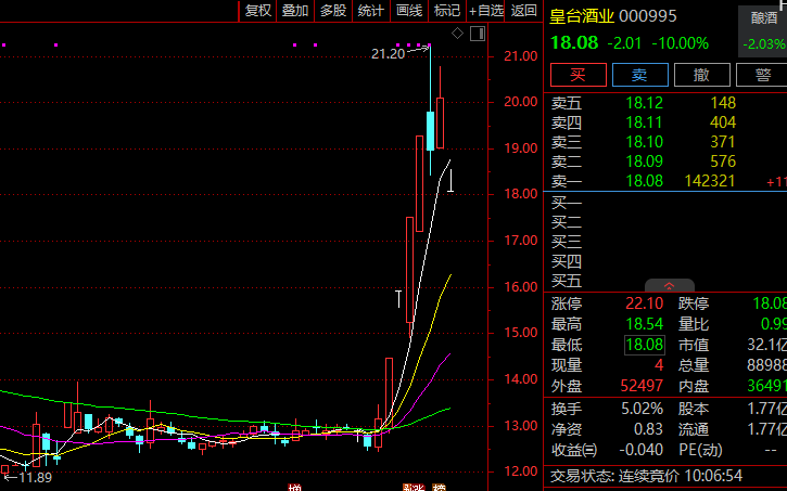 具体看各板块,白酒板块调整,皇台酒业(000995)跌停,舍得酒业、酒鬼酒、金徽酒等多股下跌。