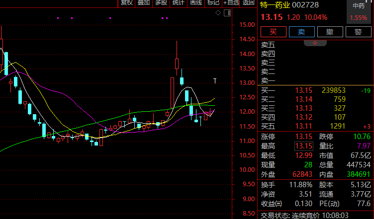 中药概念集体高开,特一药业(002728)涨停,陇神戎发、生物谷、粤万年青、佛慈制药、新天药业跟涨。