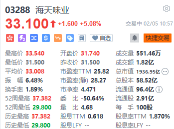 上证报中国证券网讯2月5日,港股消费板块表现活跃,泡泡玛特一度涨超5%。截至10点57分,海天味业H股涨逾5%,泡泡玛特涨幅回落至1.85%,海底捞涨逾2%。